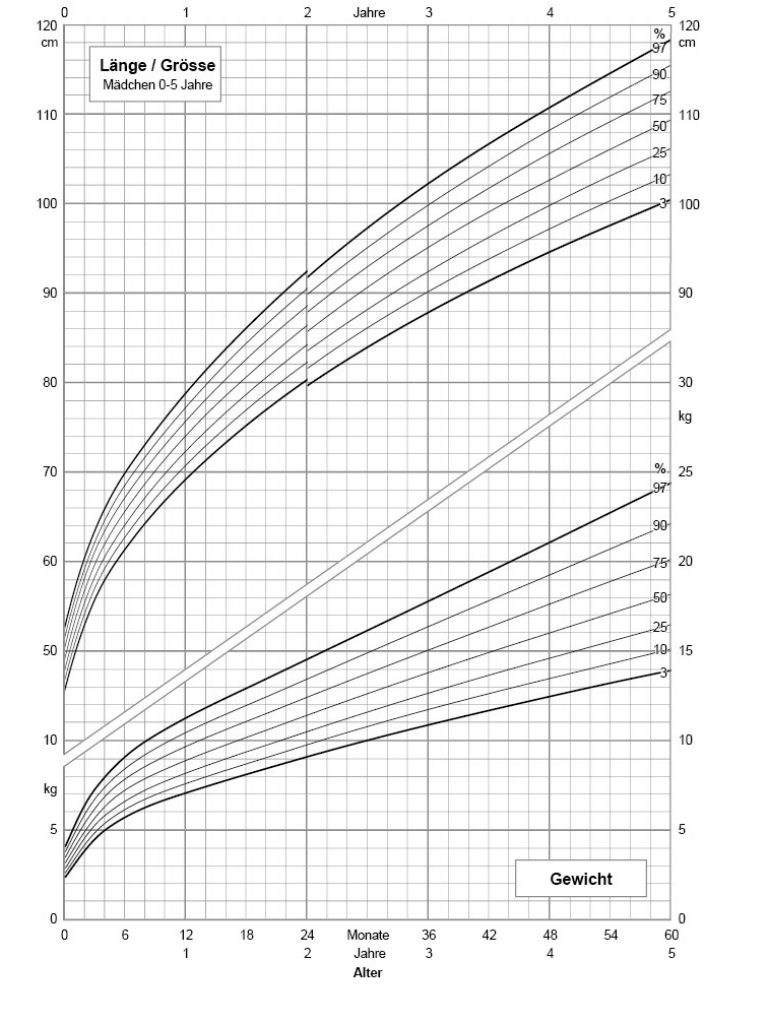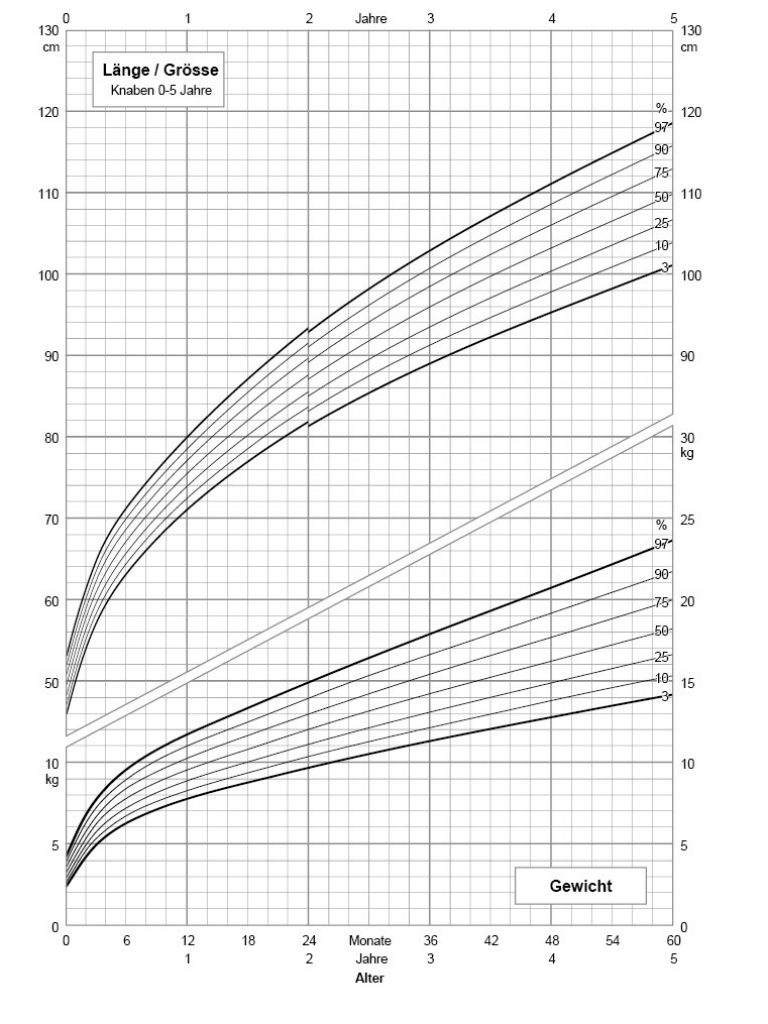 Wachstumskurven zeigen, wie sich Gewicht, Grösse und BMI im Verlauf des Kindesalters normalerweise entwickeln. Sie enthalten sogenannte Perzentile, die verdeutlichen, wie häufig bestimmte Werte in einer Altersgruppe vorkommen. Liegt das Gewicht eines Kindes auf der 50. Perzentile, entspricht das dem Durchschnitt.