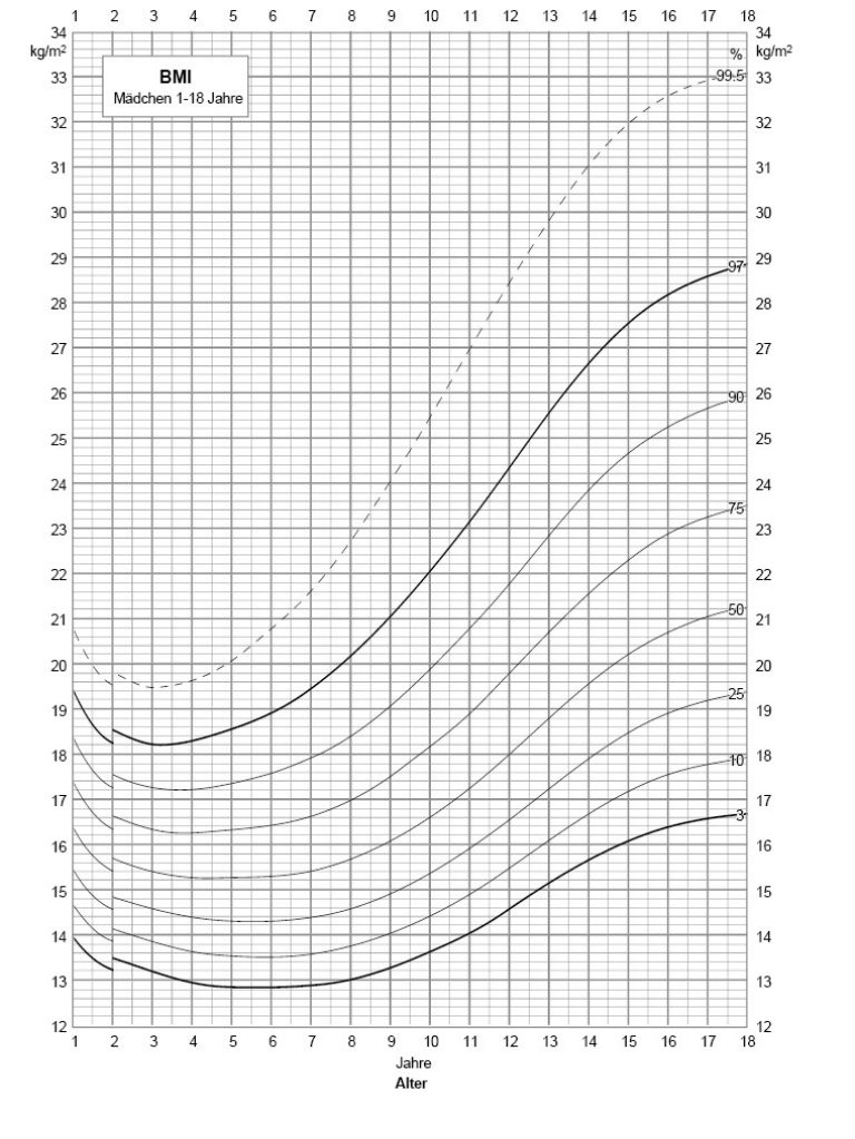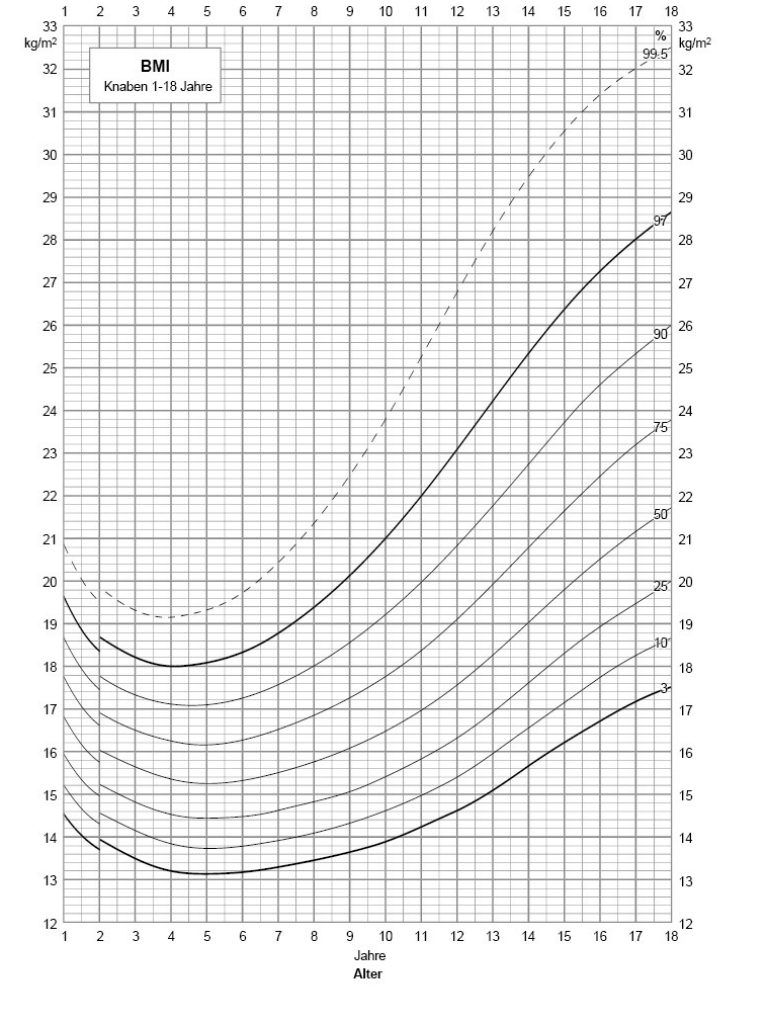 Diese Formel gilt sowohl für Jungen als auch für Mädchen. Der BMI allein hat jedoch nur eine begrenzte Aussagekraft: Bei Kindern verändert sich das Verhältnis von Gewicht zu Grösse mit zunehmendem Alter fortlaufend. Einheitliche Grenzwerte für Über- oder Untergewicht gibt es deshalb nicht. Um das Gewicht eines Kindes fachgerecht zu beurteilen, ist der Vergleich mit alters- und geschlechtsspezifischen Wachstumskurven nötig. Nur so lässt sich erkennen, ob das Gewicht Ihres Kindes im Normbereich liegt.